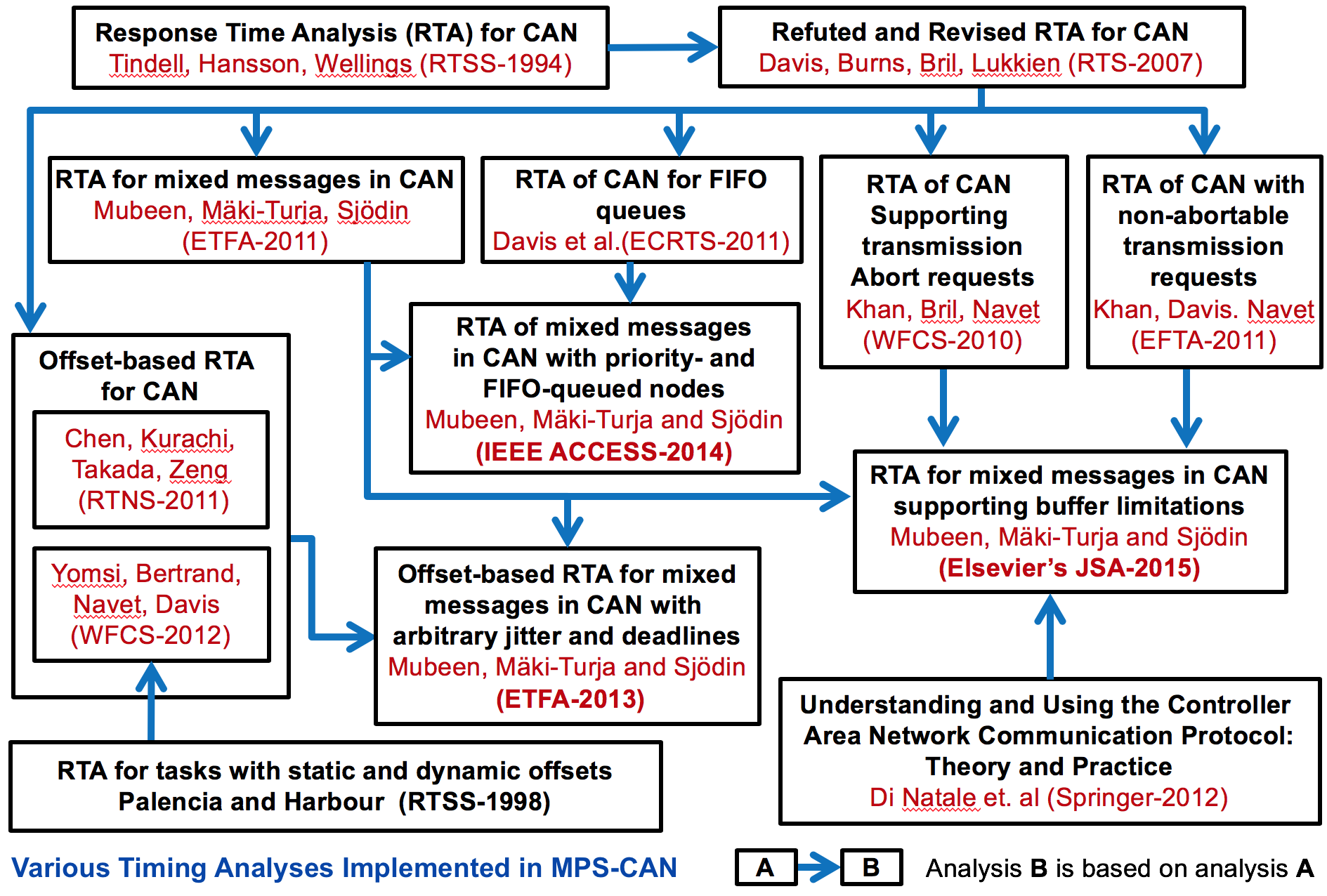 MPS-CAN Analyzer (a freeware tool developed by us) is a response time analyzer for Mixed Periodic and Sporadic messages in Controller Area Network (CAN). It implements a number of response-time analyses for CAN addressing various queueing policies, buffer limitations in the CAN controllers, and various transmission modes implemented by higher-level protocols for CAN. It also integrates the response-time analysis for Ethernet AVB and CAN-to-Ethernet AVB Gateway.