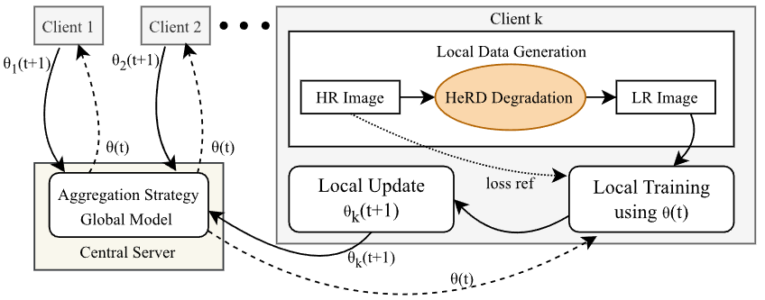This work, “HeRD: Modeling Heterogeneous Degradations for Federated Super-Resolution in Satellite Imagery,” introduces a novel strategy for training super-resolution models on decentralized satellite data while preserving privacy. Traditional methods often fail to account for the unique and complex image degradations caused by different satellite hardware, creating a gap between training and real-world application. The HeRD (Heterogeneous Realistic Degradation) strategy addresses this by realistically simulating these diverse, client-specific degradations—such as anisotropic blur and sensor noise—directly on each local device. This allows for the collaborative training of a powerful, global super-resolution model using federated learning, where raw data never leaves the owner’s control. Our extensive experiments show that this approach is highly effective, achieving image quality that is nearly on par with models trained on a centralized dataset, even in highly heterogeneous environments. This makes HeRD a viable, high-performance, and privacy-first solution for enhancing satellite imagery where data sovereignty is critical.