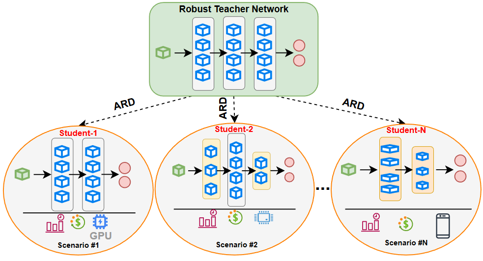 The Progressive Adversarial Robustness Distillation (ProARD) approach efficiently trains a wide range of robust student networks within a single dynamic network by using a three-step progressive sampling strategy. This strategy progressively reduces the size of the sampled student networks over the course of the training. In the first step, the depth and expansion are fixed, and different student networks are extracted by varying only the width (or kernel size for MobileNet). In the second step, the expansion is fixed while both the width (or kernel size) and depth are varied to train the student networks. Finally, the third step extracts and trains student networks by varying all three configuration parameters: width (or kernel size), depth, and expansion. In each step, robustness distillation is applied between the dynamic teacher and the selected students, and the student parameters are shared with the dynamic teacher network.