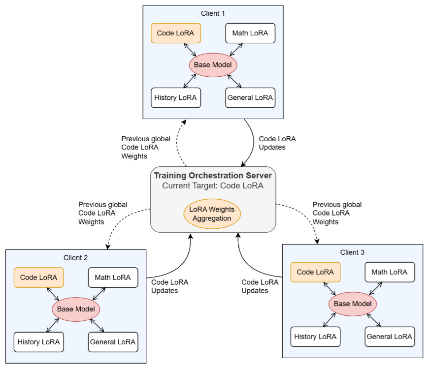 FedLoRASwitch is a framework that combines federated learning (FL), Low-Rank Adaptation (LoRA), and Mixture-of-Experts (MoE) principles to enable the efficient and private adaptation of large language models (LLMs). The tool operates by collaboratively training multiple domain-specific LoRA “experts” (such as for math or coding) across decentralized clients without sharing raw data. At inference time, a lightweight Transformer router analyzes incoming queries to select the most relevant expert, which is then dynamically “hot-swapped” or merged with a frozen base model to generate a response. Experimental results show that this approach can provide substantial performance gains, such as an 8-fold increase in mathematical reasoning accuracy, while reducing communication overhead by approximately 40x compared to traditional full-parameter training.